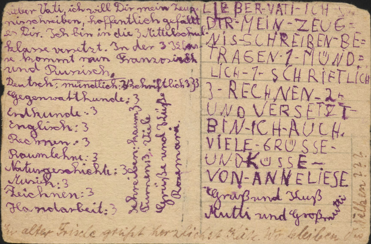 Rosemarie (links) und Anneliese (rechts) berichten ihrem kriegsgefangenen Vater über ihre Schulzeugnisse (Postkarte vom 28.7.47, siehe Transcribathon, item 37 of 89)