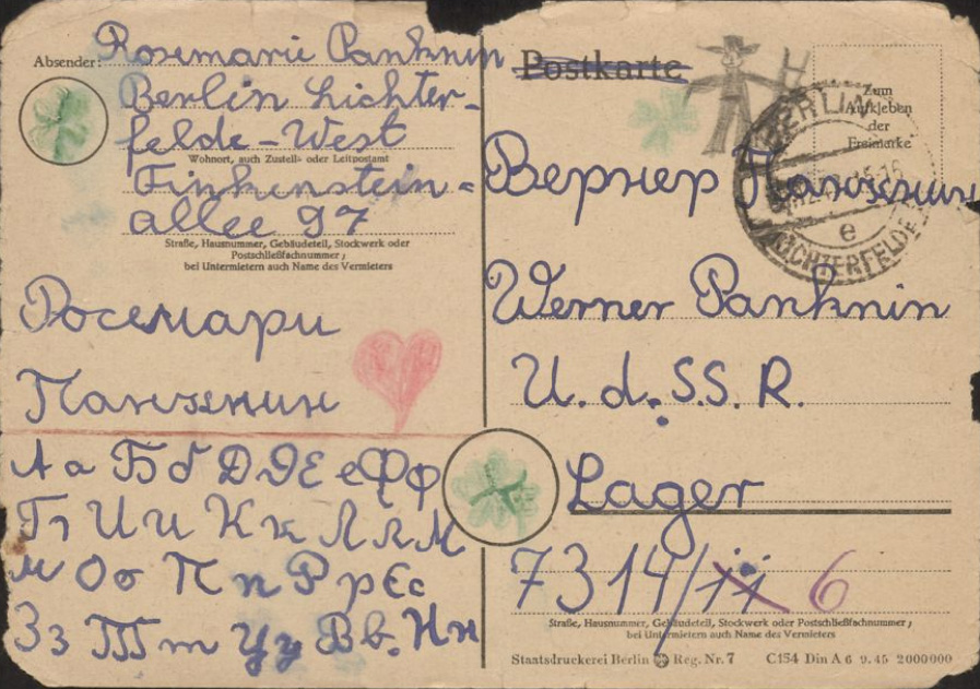 Rosemarie schreibt auf Russisch in der Hoffnung, dass die Karte den Vater erreicht. (Postkarte vom 28.12.47, siehe Transcribathon, item 72 of 89)