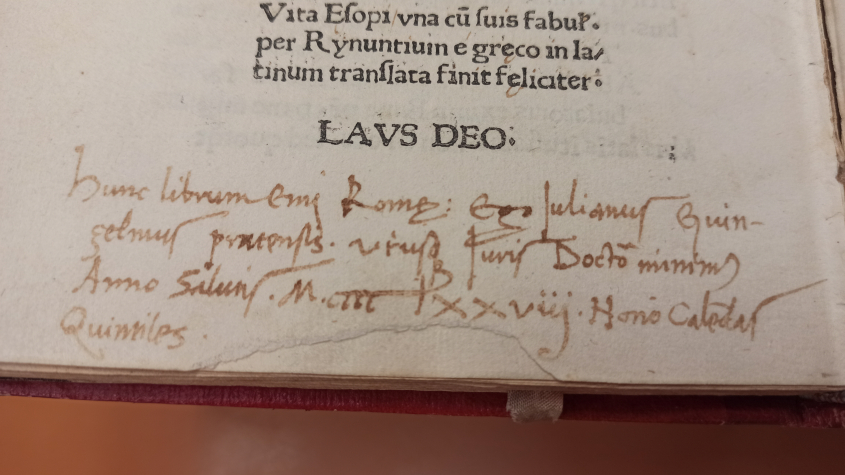 One remarkable example is an edition of Aesop’s Vita et Fabulae (8° Inc 3393), a quarto edition on Chancery sheets printed in Rome around 1475 by Bartholomaeus Guldinbeck or Wendelinus de Wila (GW 336, ISTC ia00099500). The copy is bound in early 19th-century red leather with gilt tooling, yet its earliest recorded owner takes us back to the 15th century. The jurist Giuliano Guizzelmi of Prato acquired the book in Rome in 1478, leaving an explicit purchase note that precisely records the date and place of acquisition. The volume bears extensive manuscript annotations by Guizzelmi, consisting of keyword extraction, reading marks, manicules, revealing his active engagement with the text. On the last leaf, a long inscription dated 24 October 1505 attests that he completed reading and annotating the volume. This kind of evidence of use offers rare insight into the scholarly practices of early Roman book owners. The subsequent history of the same volume further testifies to the mobility of early printed books. In the late 18th and early 19th century, the copy belonged to Count Dimitrij Petrovich Boutourlin, a Russian diplomat and bibliophile whose first library, located in Moscow, was destroyed in 1812. He later rebuilt his collection, which became well-known among bibliophiles and was catalogued and sold in multiple auctions. His armorial bookplate is found on the front pastedown. The volume later entered the Royal Library in Berlin. This layered provenance – a 15th-century Italian jurist to a Russian aristocratic library, and finally to a major European institution – captures the transnational trajectories that incunabula frequently followed.