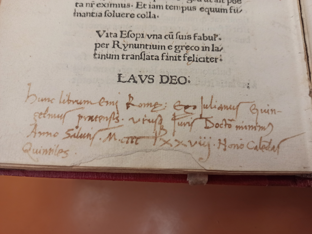 One remarkable example is an edition of Aesop’s Vita et Fabulae (8° Inc 3393), a quarto edition on Chancery sheets printed in Rome around 1475 by Bartholomaeus Guldinbeck or Wendelinus de Wila (GW 336, ISTC ia00099500). The copy is bound in early 19th-century red leather with gilt tooling, yet its earliest recorded owner takes us back to the 15th century. The jurist Giuliano Guizzelmi of Prato acquired the book in Rome in 1478, leaving an explicit purchase note that precisely records the date and place of acquisition. The volume bears extensive manuscript annotations by Guizzelmi, consisting of keyword extraction, reading marks, manicules, revealing his active engagement with the text. On the last leaf, a long inscription dated 24 October 1505 attests that he completed reading and annotating the volume. This kind of evidence of use offers rare insight into the scholarly practices of early Roman book owners. The subsequent history of the same volume further testifies to the mobility of early printed books. In the late 18th and early 19th century, the copy belonged to Count Dimitrij Petrovich Boutourlin, a Russian diplomat and bibliophile whose first library, located in Moscow, was destroyed in 1812. He later rebuilt his collection, which became well-known among bibliophiles and was catalogued and sold in multiple auctions. His armorial bookplate is found on the front pastedown. The volume later entered the Royal Library in Berlin. This layered provenance – a 15th-century Italian jurist to a Russian aristocratic library, and finally to a major European institution – captures the transnational trajectories that incunabula frequently followed.