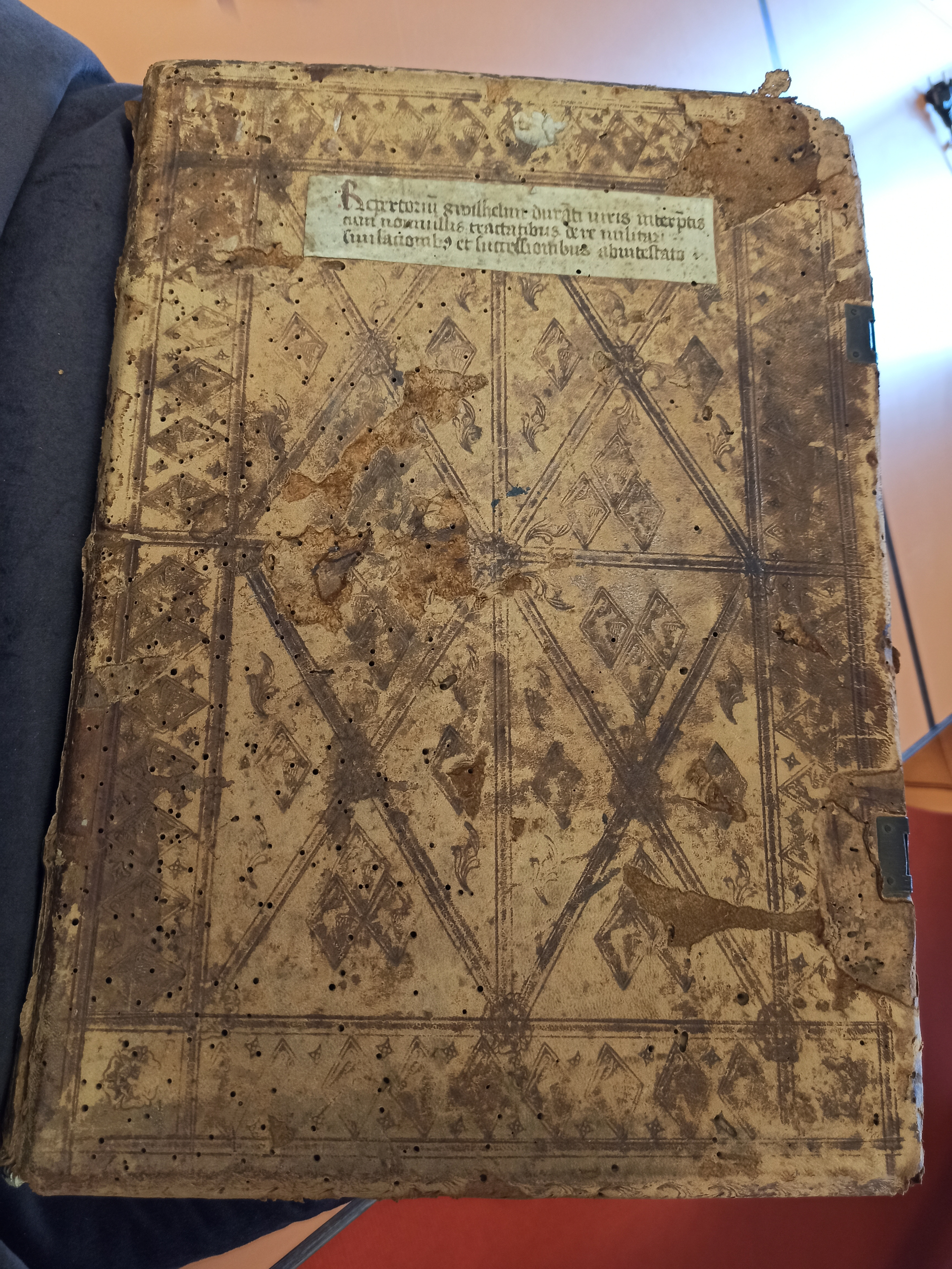 Equally fascinating was a large volume containing Bartholomaeus Cepolla’s De simulatione contractuum (Inc 3357 an 2° Inc 3549), a folio edition on Royal sheets dated 1 September 1474 likely “In domo Antonii et Raphaelis de Vulterris” (GW 6505, ISTC ic00397000) bound together with two other legal works printed the same year in Rome. The binding – 15th-century German blind-tooled pigskin over wooden boards – features a geometric decorative pattern and retains structural evidence such as remnants of metal furniture. The volume provenance traces back to the cathedral library of Freising, where it formed part of the ecclesiastical collection prior to secularization in the early 19th century. Stamps of the Munich Royal Library attest to its subsequent transfer to that institution, before it ultimately entered the Berlin library, certainly sold as a duplicate from Munich. This example not only demonstrates the movement of legal incunabula across ecclesiastical and state repositories but also shows an interesting example of an early German binding.